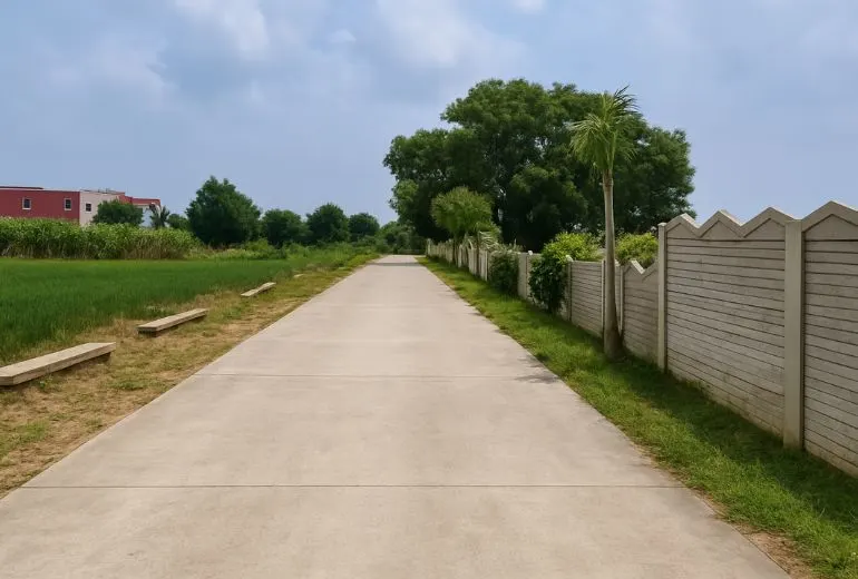 Plot sizes include INR 100, 200, and 300 square yards, thoughtfully planned for both residential and investment needs. Each plot is connected through wide internal roads and equipped with essential infrastructure such as: